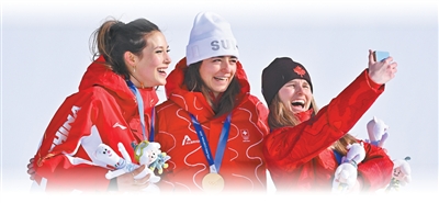 自由式滑雪女子坡面障碍技巧决赛后,亚军中国队选手谷爱凌(左)和冠军、季军合影。新华社记者 张宏祥摄
