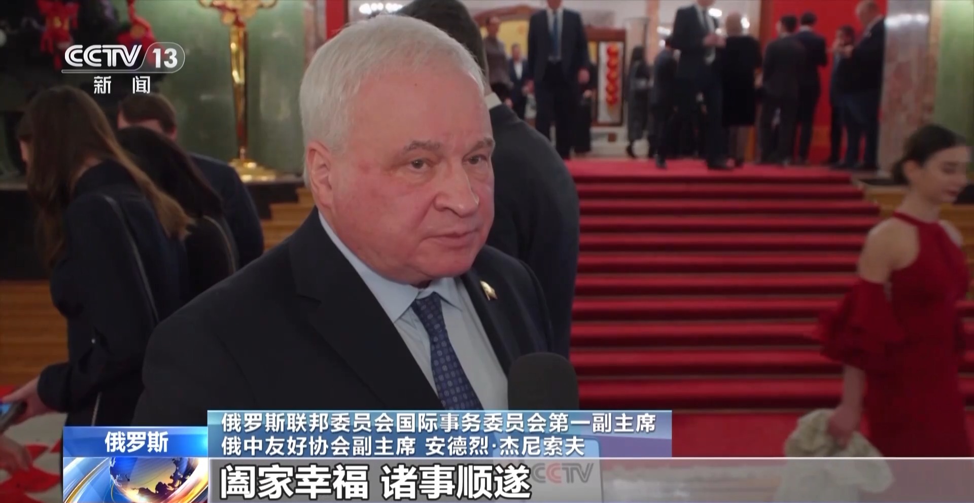 俄罗斯联邦委员会国际事务委员会第一副主席俄中友好协会副主席安德烈·杰尼索夫:中国人喜欢祝愿身体健康,阖家幸福,诸事顺遂,中文是“万事如意”,这也是我想送上的祝福。