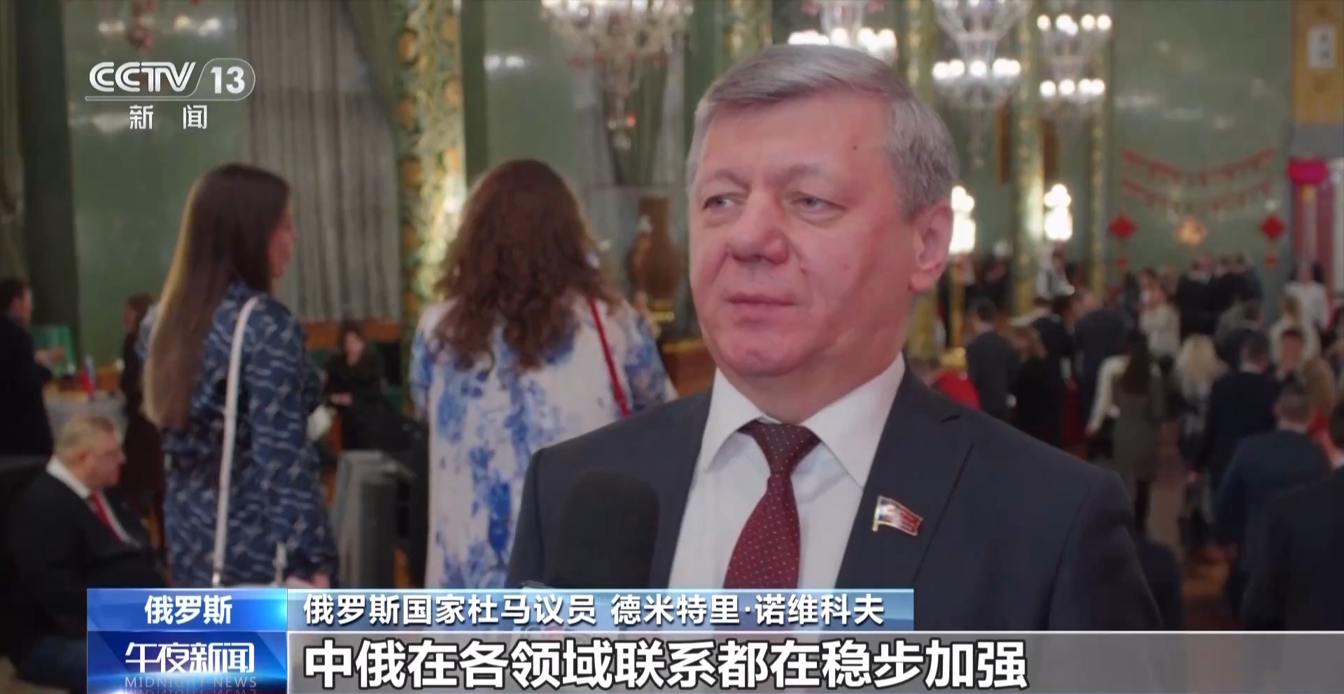 俄罗斯国家杜马议员德米特里·诺维科夫:从贸易额增长到文化体育交流,中俄在各领域联系都在稳步加强,如今中国积累了独特的发展经验,值得俄罗斯深入研究,借鉴其中最精华、最宝贵的部分。相信新的一年,中国必将取得新的成就,实现新的突破。