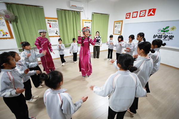 全国政协委员、乐作舞非遗传承人杨钰尼(中)教孩子们跳乐作舞。董腾飞/摄