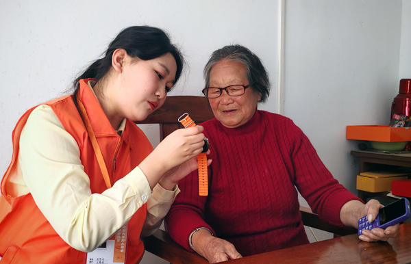 青年学子教老人使用手表心率监测、跌倒报警等功能。(南昌大学供图)