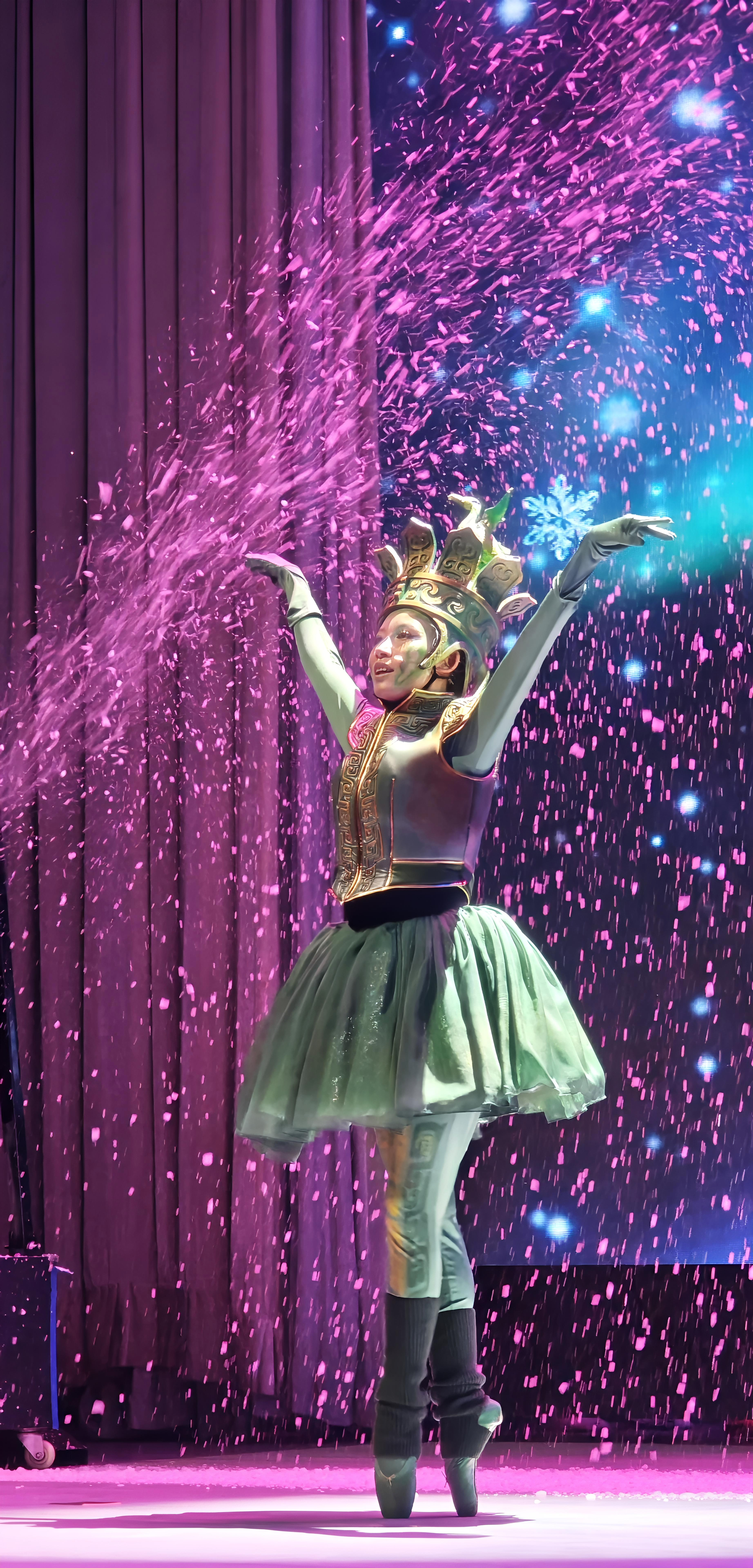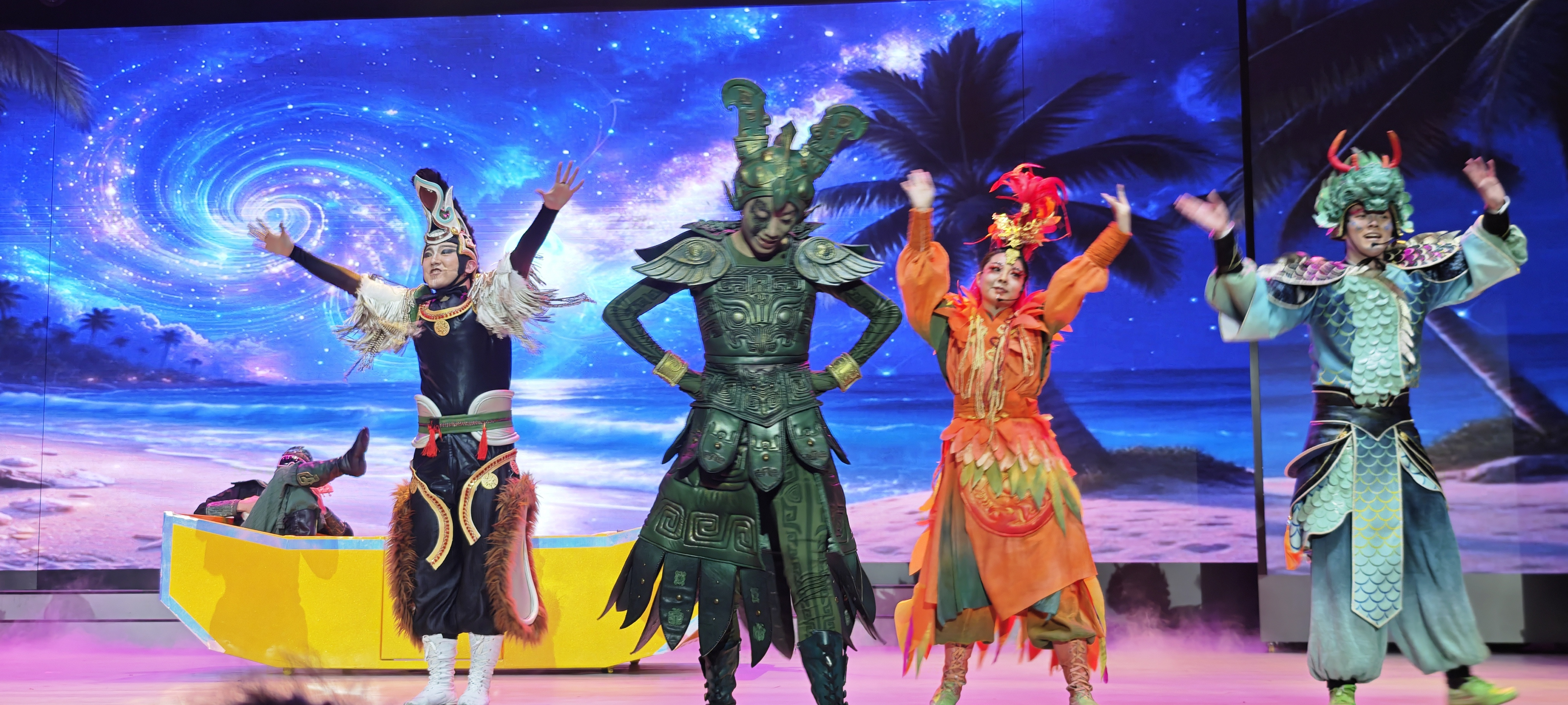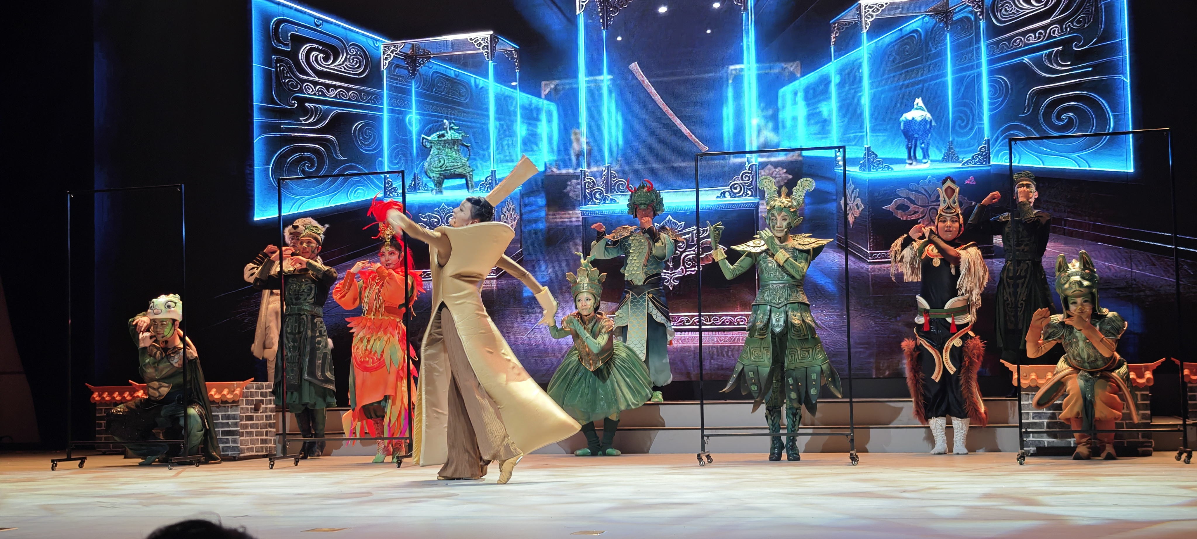 演员坐在舞台边带领大家一起欢唱,走下舞台到观众中间去互动……作为打破传统观演边界的创新之作,该剧构建了独特的沉浸式表达体系,演出区域覆盖整个演出厅,观众不再是远距离旁观者,而是跟随文物角色移步换景,在节奏舞、推雪球等趣味互动中深度参与剧情推进。