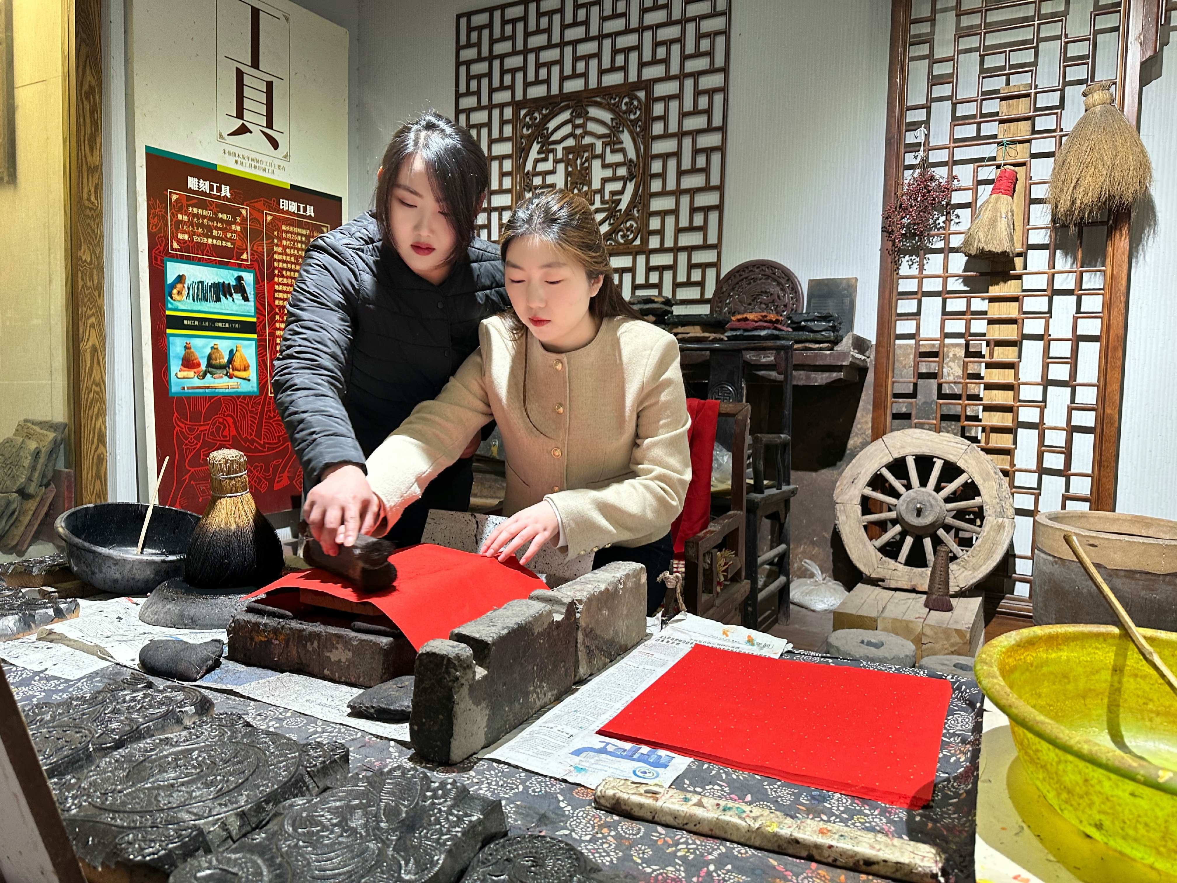 如今,这座博物馆不仅免费向所有人敞开大门,更成了一个充满活力的“研学”天地。尹雪瑶介绍说:“现在,整个开封市都非常重视朱仙镇木版年画的传承和发展,鼓励我们让这项老手艺更接地气,走进更多人的生活。我们家现在已经是8所高校的研学实践点,同时也是‘巧媳妇’工程的联络基地,姐妹们常来这里学习手艺、交流心得。”