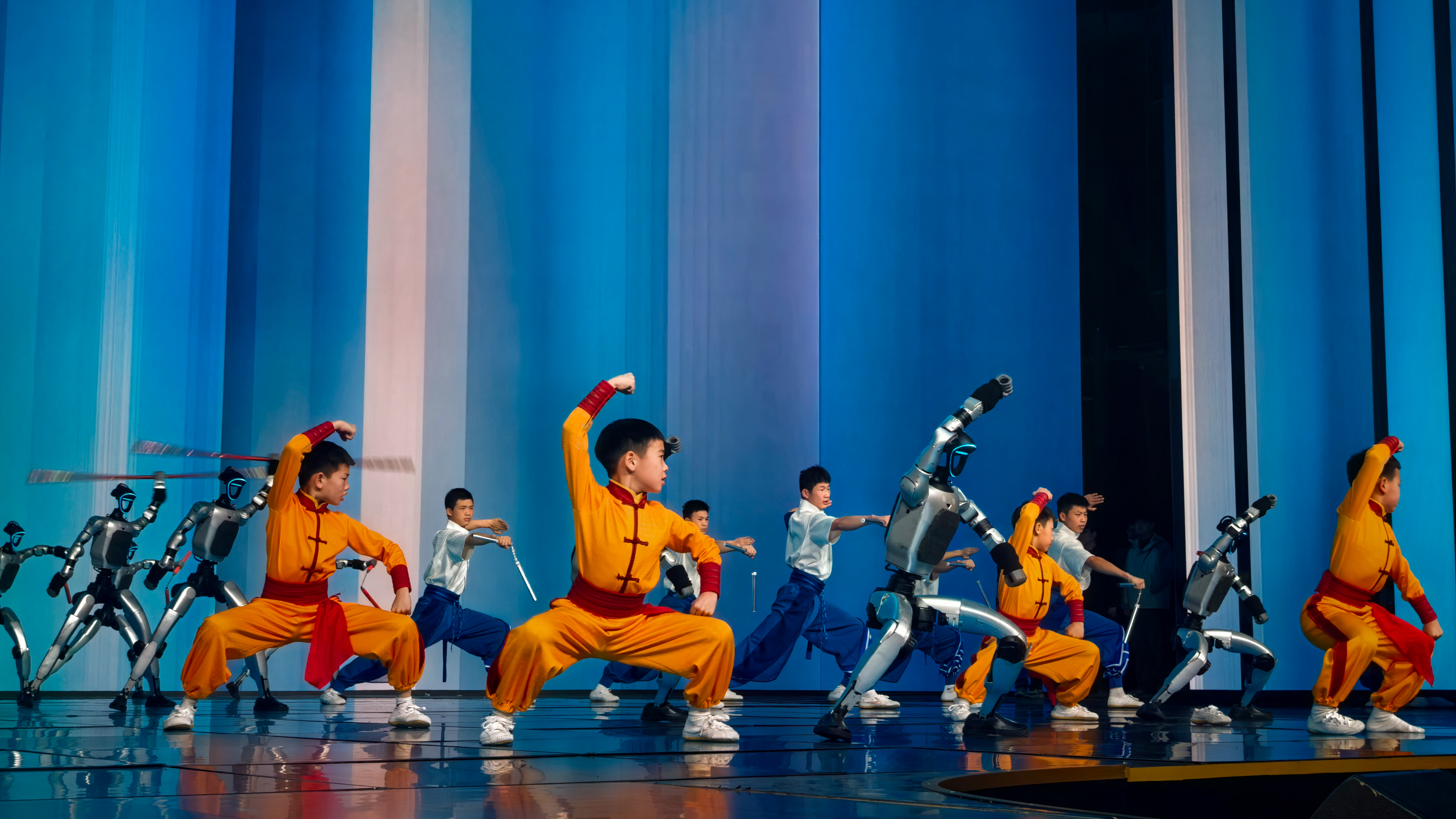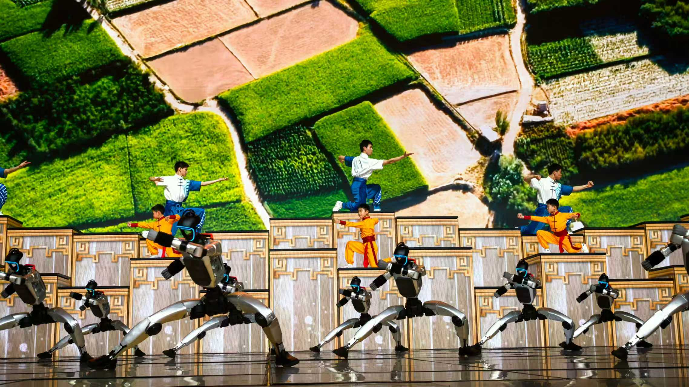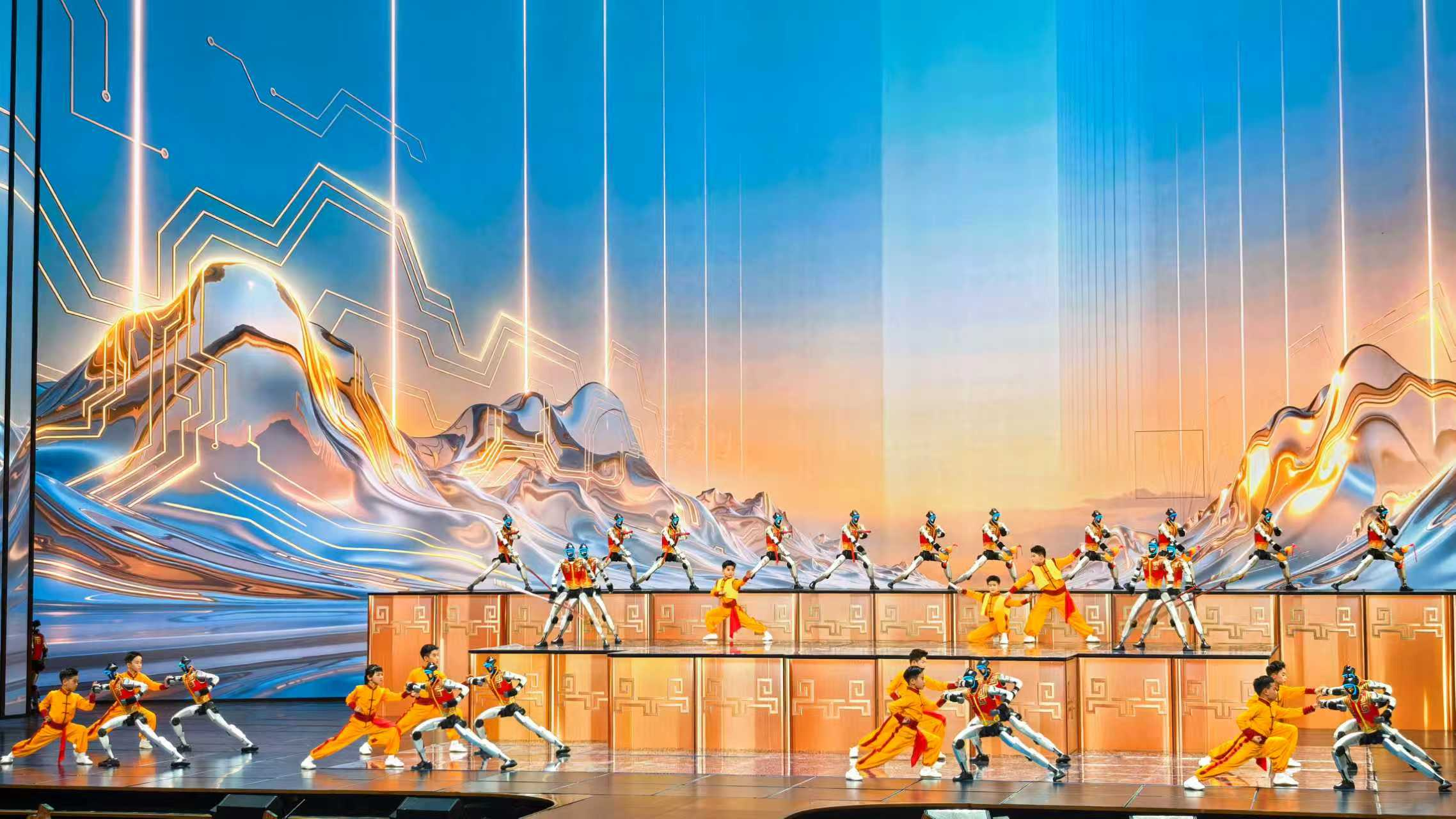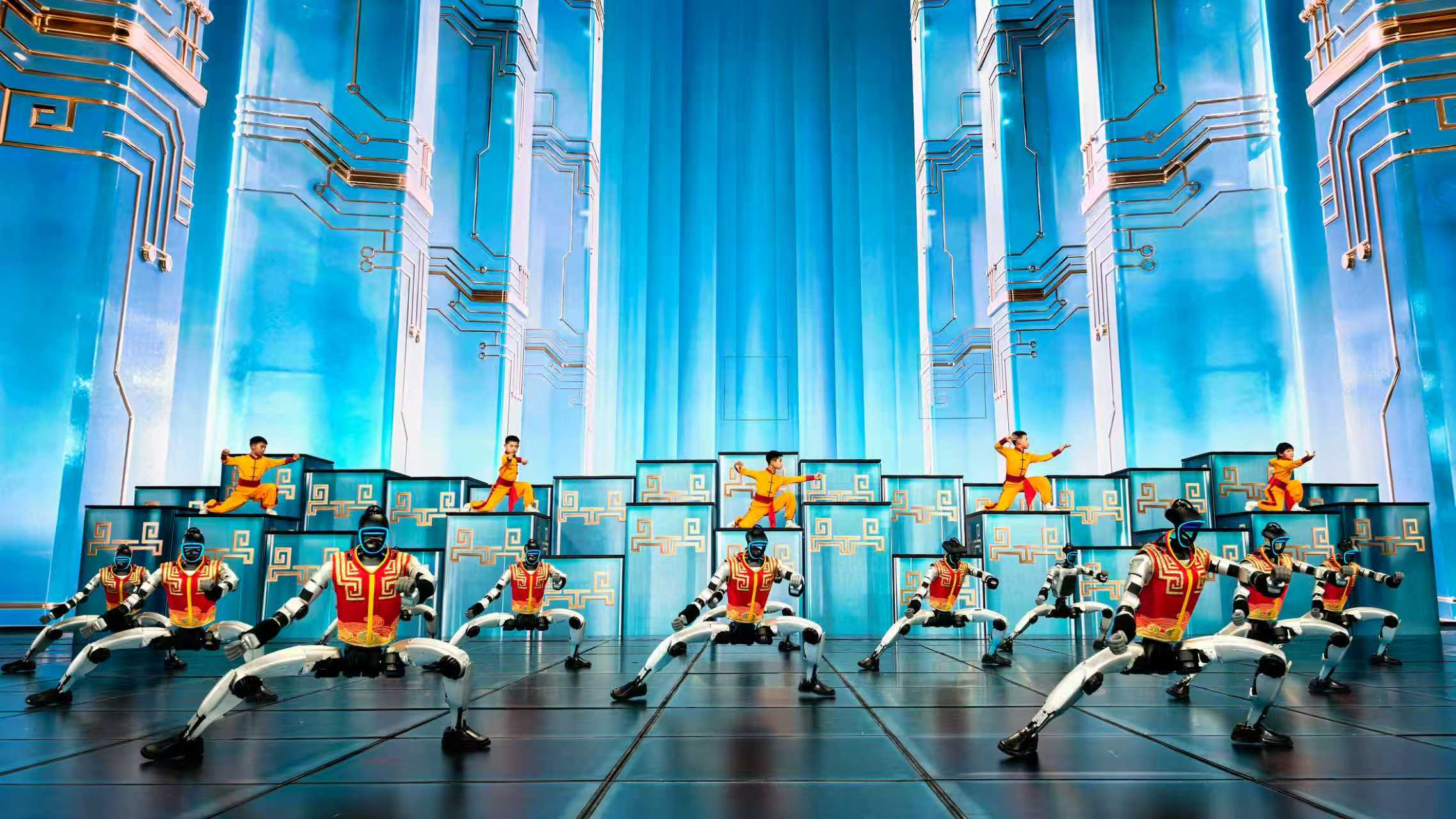 欢快的旋律中,三名功夫少年自观众席跃出,一招一式利落刚劲。大幕徐升,身披科技感的机器人整齐列阵,与少年们同步起势,人机合一的武术操练动作划一、气势如虹,瞬间点燃全场,尽显传统武魂与现代科技的初次碰撞。