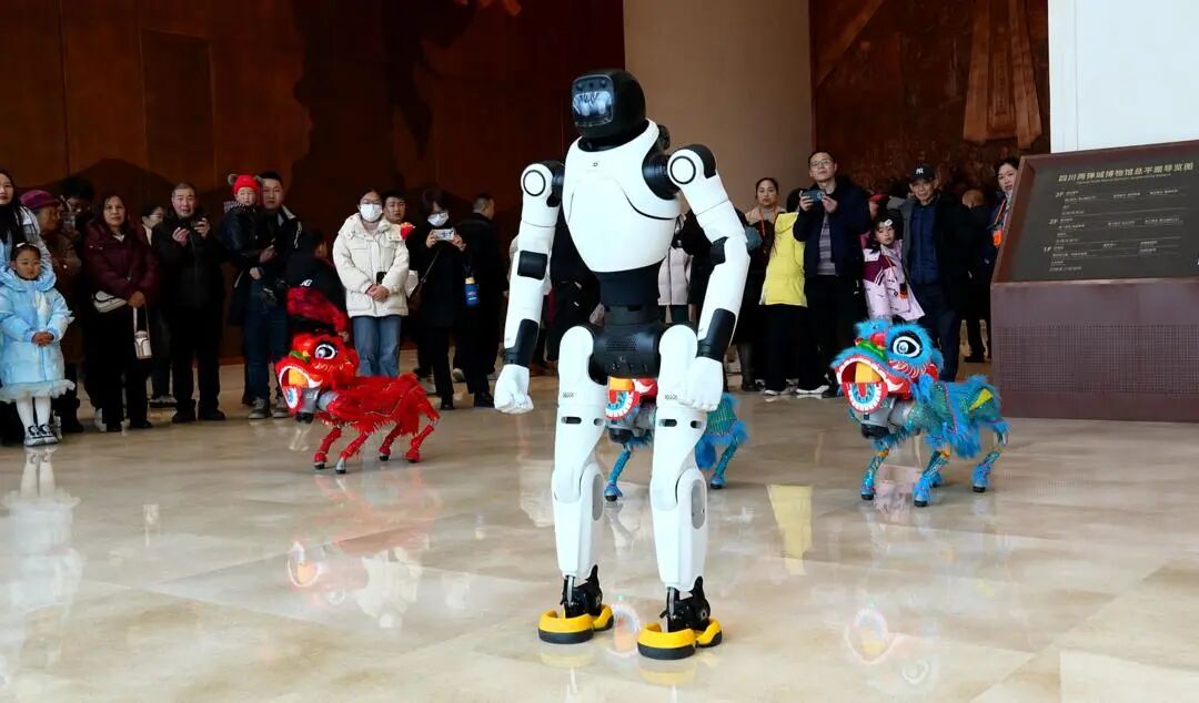 在四川绵阳梓潼两弹城景区,智能机器人与机器狗同时登场,为游客们表演多种技能,引得现场游客拍手叫好。智能机器人为游客表演踢腿、转身、出拳、击打等武术套路和太极拳动作;机器狗身穿醒狮服装,显得十分俏皮可爱。在工作人员的操控下,机器狗熟练地蹲地、起身、前进、侧翻、后空翻,做出很多高难度的舞狮动作,充分展示出景区独特的科技魅力。
