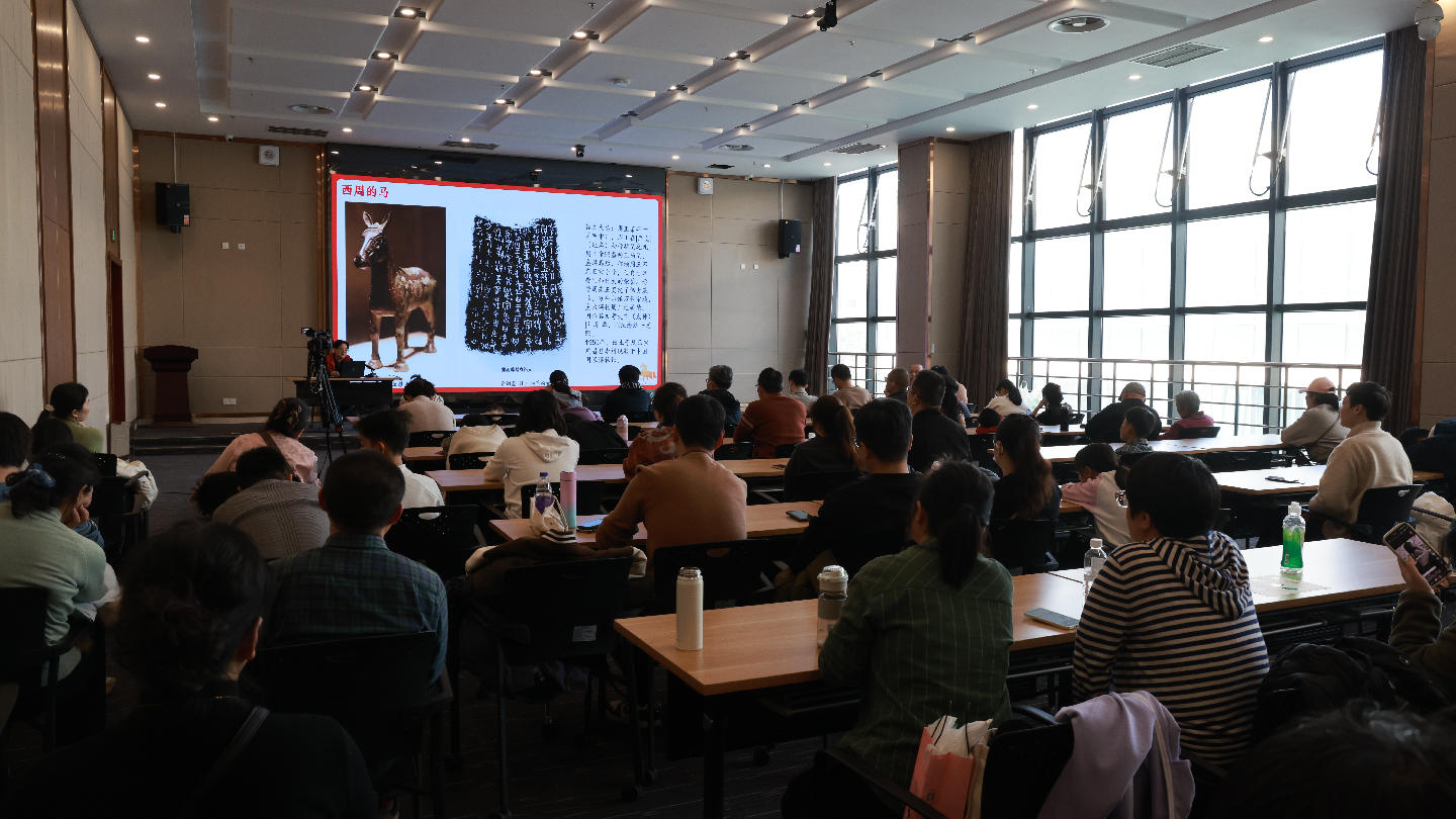 “有关商代‘马’的故事,不妨让我们从3000年前的‘武丁追犀’讲起……”为了激发听众了解历史的兴趣,刘文科将一块布满甲骨文的骨片图片呈现在PPT上,再现商王武丁追逐犀牛的意外“车祸”,来揭示早在商朝人们就利用马匹作为交通工具的历史事实,吸引现场听众凝神聆听,感受千年历史的再现回响。