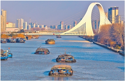 京杭大运河江苏淮安段,满载物资的船舶有序航行。