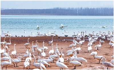 在山西运城市平陆三湾大天鹅景区栖息的白天鹅。