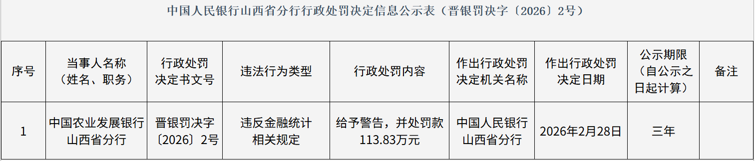 【大河财立方消息】中国人民银行山西省分行近日披露的行政处罚决定信息显示,因违反金融统计相关规定,中国农业发展银行山西省分行被警告,并处罚款113.83万元。