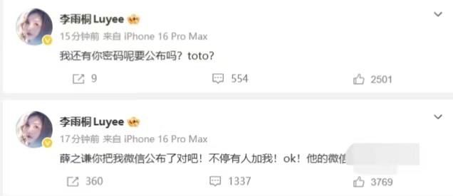 中新网北京3月4日电(记者 郎朗)近日,歌手薛之谦和李雨桐相关事件引起热议。李雨桐称自己微信号被公开,随即也公布了一个微信号的相关信息。截至发稿,相关博文已被删除。