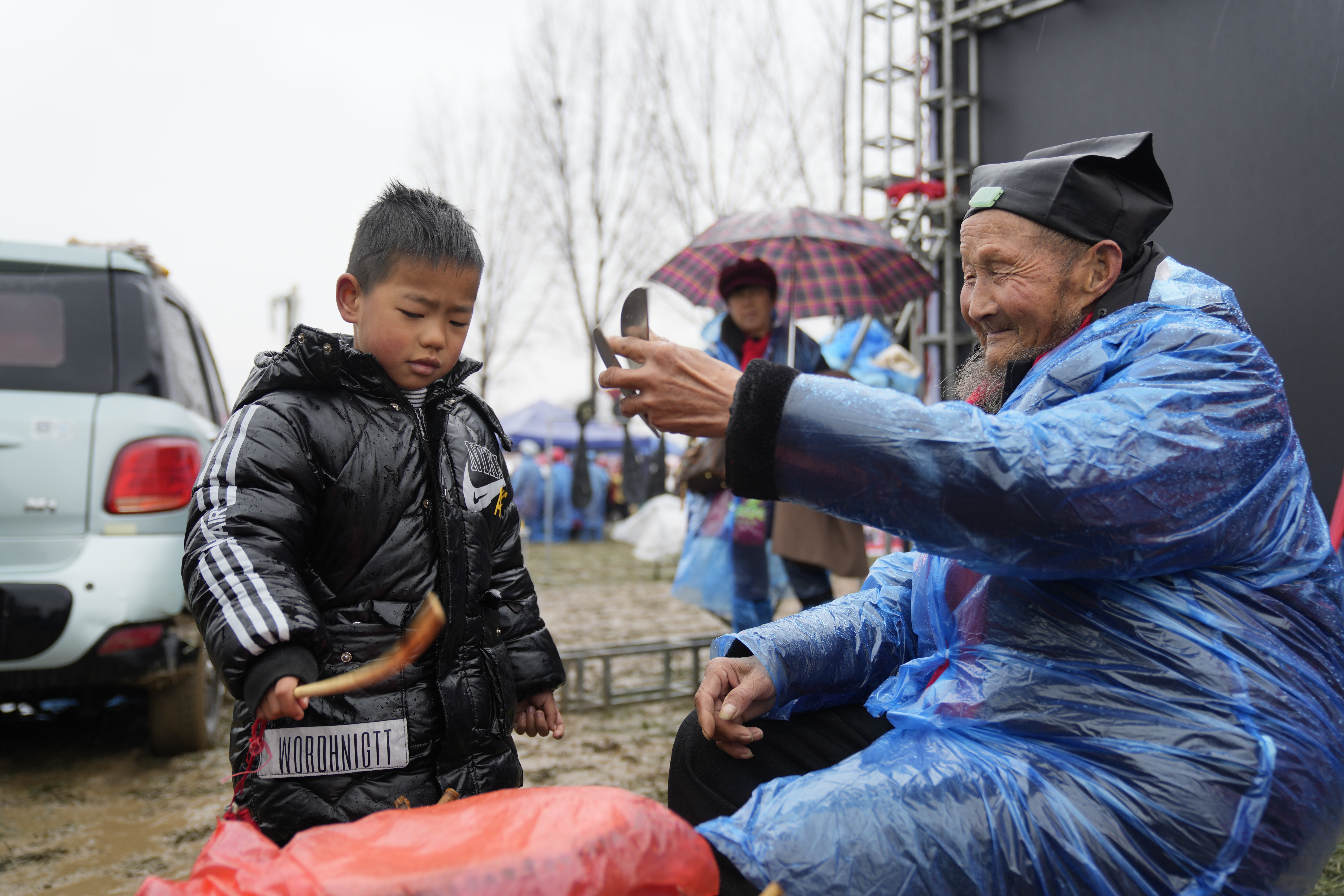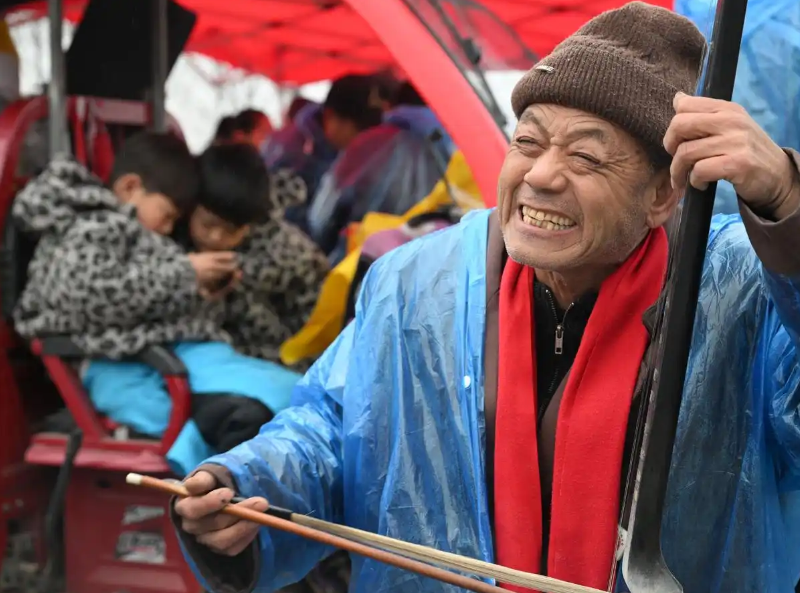临时搭建的雨棚下,披着雨衣的艺人,全情投入。拉弦子的,手臂随着韵律晃动;说书人,声情并茂。