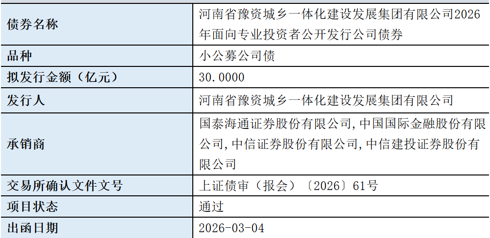 【大河财立方消息】3月4日,河南省豫资城乡一体化建设发展集团有限公司2026年面向专业投资者公开发行公司债券项目获上交所通过。