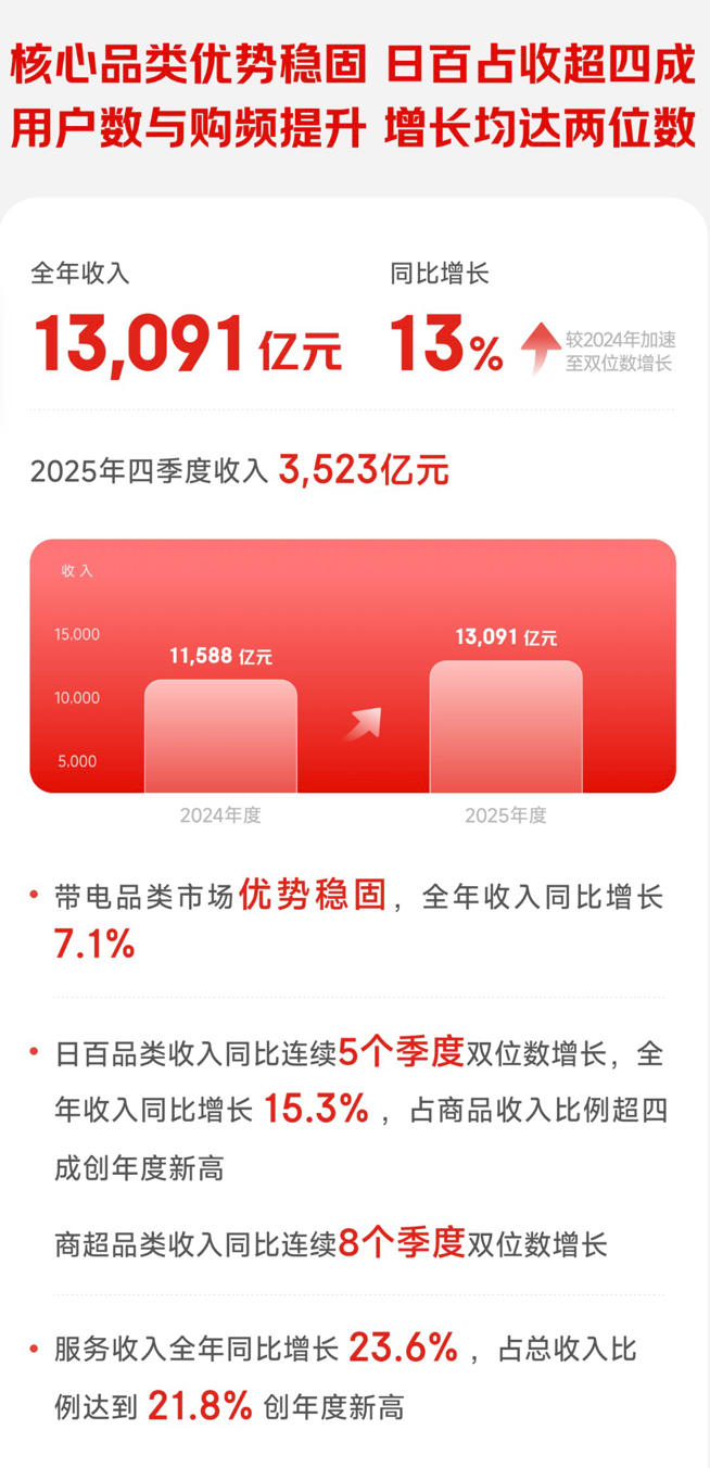作为京东的优势品类,带电品类虽受2024年高基数影响,2025年全年收入仍实现同比7.1% 的增长,京东通过产品创新、场景创新、服务创新,持续重塑该品类的竞争优势。在产品创新方面,京东上线涵盖智能人形机器人、四足机器狗、手机、无人机、相机等品类的3C数码自营租赁服务,满足用户多元化、个性化使用需求;在场景创新方面,宇树科技全球首店落地京东MALL北京双井店,全国线下 3C 数码门店成为用户体验最新科技产品的新场景。马年春晚开播2小时,京东平台“机器人”订单量环比增长150%,成为技术赋能消费的生动体现。同时京东送装一体服务覆盖范围进一步扩大,以优质服务巩固了在带电品类的领先市场地位。