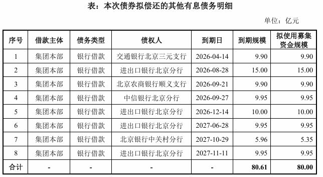 募集说明书显示,本次公司债券募集资金扣除发行费用后,拟将20亿元用于偿还到期公司债券本金,80亿元用于偿还其他到期有息债务。