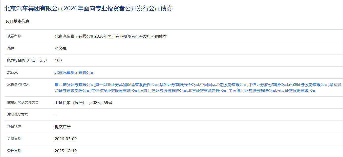 【大河财立方消息】3月9日,北京汽车集团有限公司2026年面向专业投资者公开发行公司债券项目提交注册。