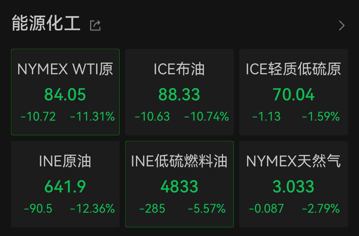 【大河财立方消息】北京时间3月10日晚间,国际油价短线走低。截至发稿,布伦特原油期货跌幅扩大近11%,报88.33美元/桶;WTI原油期货跌幅扩大至11%,报84.05美元/桶。