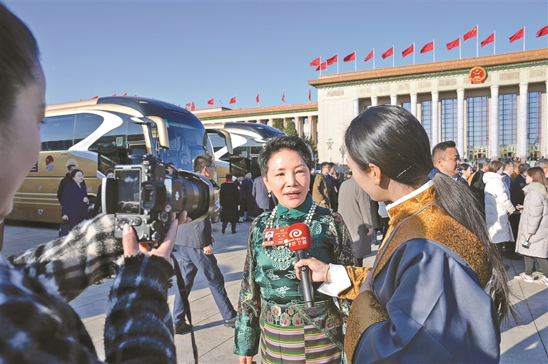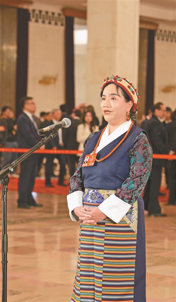 图为3月7日,全国政协十四届四次会议第二场“委员通道”集体采访活动在人民大会堂举行。这是住藏全国政协委员明吉措姆接受媒体采访。记者 旦增旺姆 摄