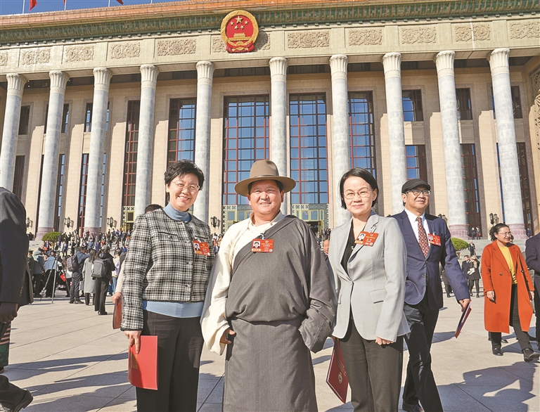 图为住藏全国政协委员扎西顿珠与其他全国政协委员一起合影。本报记者 陶玥 摄