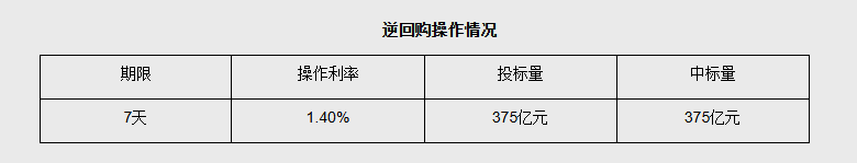 【大河财立方消息】3月13日,中国人民银行以固定利率、数量招标方式开展了375亿元7天期逆回购操作。具体情况如下: