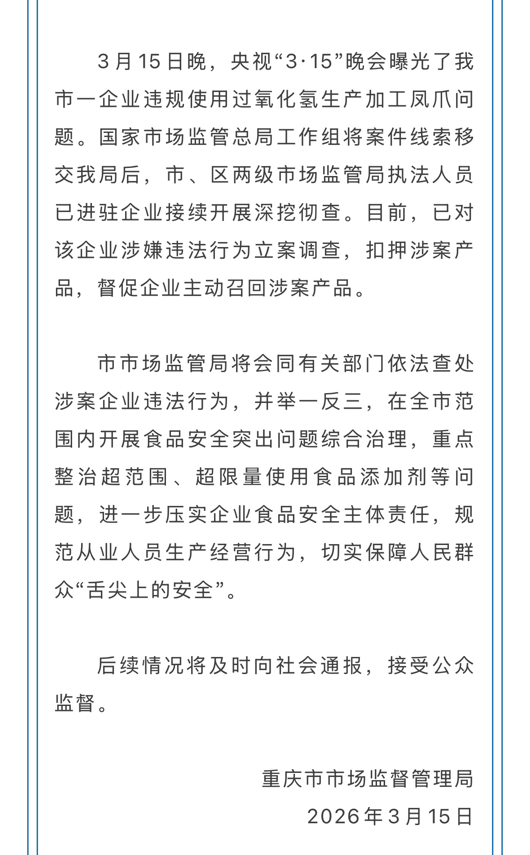 央广网重庆3月15日消息(记者白刁尹)3月15日晚,央视“3·15”晚会曝光川渝地区多家企业生产的泡椒鸡爪违规使用双氧水漂白。“乖媳妇”鸡爪关联公司重庆市曾巧食品有限公司被点名。当晚22时4分,重庆市市场监管局发布情况通报称,市、区两级市场监管局执法人员已进驻企业接续开展深挖彻查。目前,已对该企业涉嫌违法行为立案调查,扣押涉案产品,督促企业主动召回涉案产品。