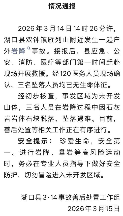 3月14日14时26分许,江西九江湖口县双钟镇雁列山附近发生一起户外岩降事故。接报后,湖口县应急、公安、消防、医疗等部门赶赴现场开展救援。经120医务人员现场确认,三名坠落人员均已无生命体征。