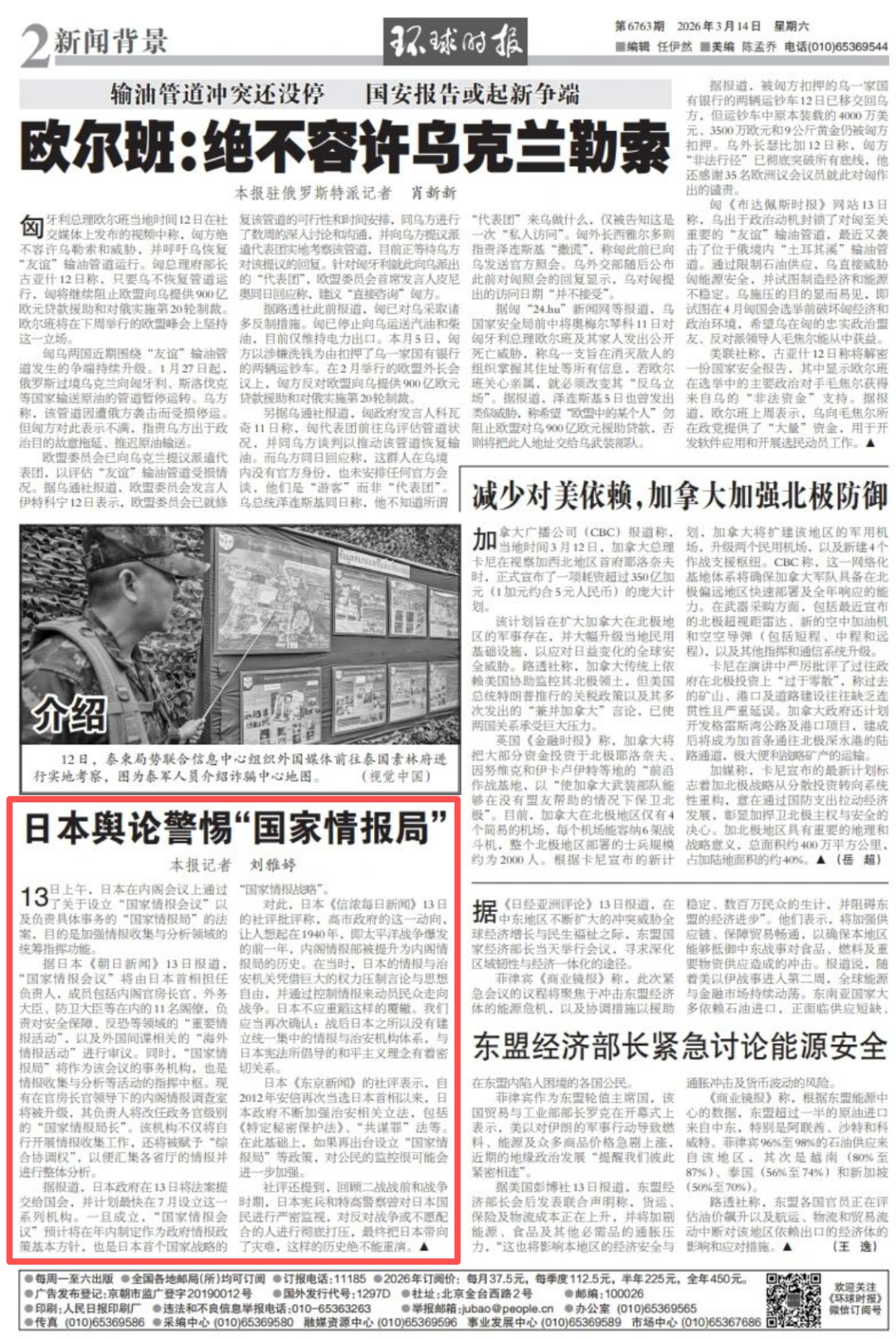 对此,日本《信浓每日新闻》13日的社评批评称,高市政府的这一动向,让人想起在1940年,即太平洋战争爆发的前一年,内阁情报部被提升为内阁情报局的历史。在当时,日本的情报与治安机关凭借巨大的权力压制言论与思想自由,并通过控制情报来动员民众走向战争。日本不应重蹈这样的覆辙。我们应当再次确认:战后日本之所以没有建立统一集中的情报与治安机构体系,与日本宪法所倡导的和平主义理念有着密切关系。