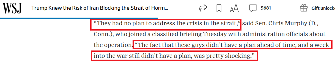《华尔街日报》14日的报道指出,当前霍尔木兹海峡通行受阻及由此引发的经济动荡,反映出美国政府在发动军事打击时缺乏规划与深思熟虑。