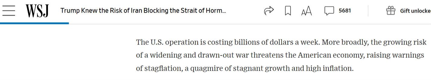盟友之外,美国民众也在为这场军事行动“埋单”。《华尔街日报》的报道称,美国国务院直到战争开始后才敦促美国公民离开该地区国家或撤离部分大使馆。而当时,商业空域已关闭,数万美国人滞留中东,美国的外交官们在部分大使馆也处于危险之中;此外,美国此次军事行动每周耗资数十亿美元。战争不断扩大且长期延宕的风险日益加剧,正威胁着美国经济,甚至引发“滞胀”风险。
