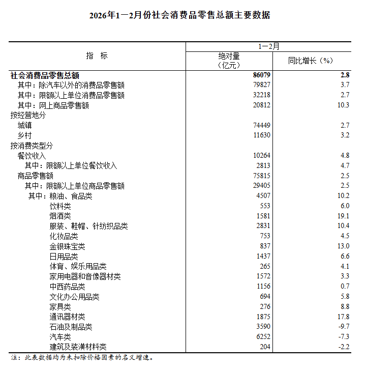【大河财立方消息】3月16日,国家统计局数据显示,1—2月份,社会消费品零售总额86079亿元,同比增长2.8%。其中,除汽车以外的消费品零售额79827亿元,增长3.7%。