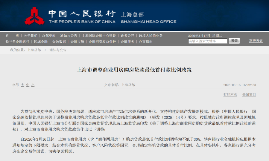 【大河财立方 记者 王宇 朱娟】继陕西、湖南、湖北及深圳等地调整商业用房购房贷款政策后,上海也加入调整行列。3月16日,中国人民银行上海市分行联合国家金融监督管理总局上海监管局印发《关于调整上海市商业用房购房贷款最低首付款比例政策的通知》,明确将上海市商业用房(含“商住两用房”)购房贷款最低首付款比例调整为不低于30%。