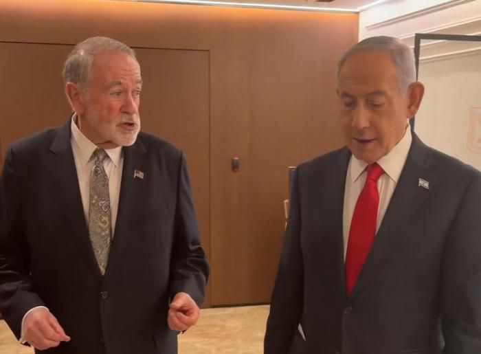 内塔尼亚胡(右)与美国驻以色列大使迈克·赫卡比。图片来源:内塔尼亚胡社交媒体账号