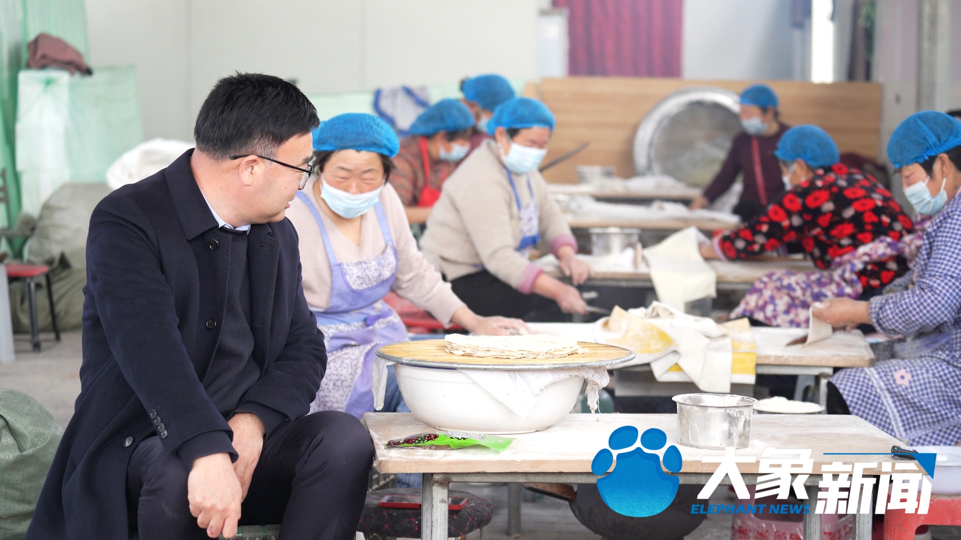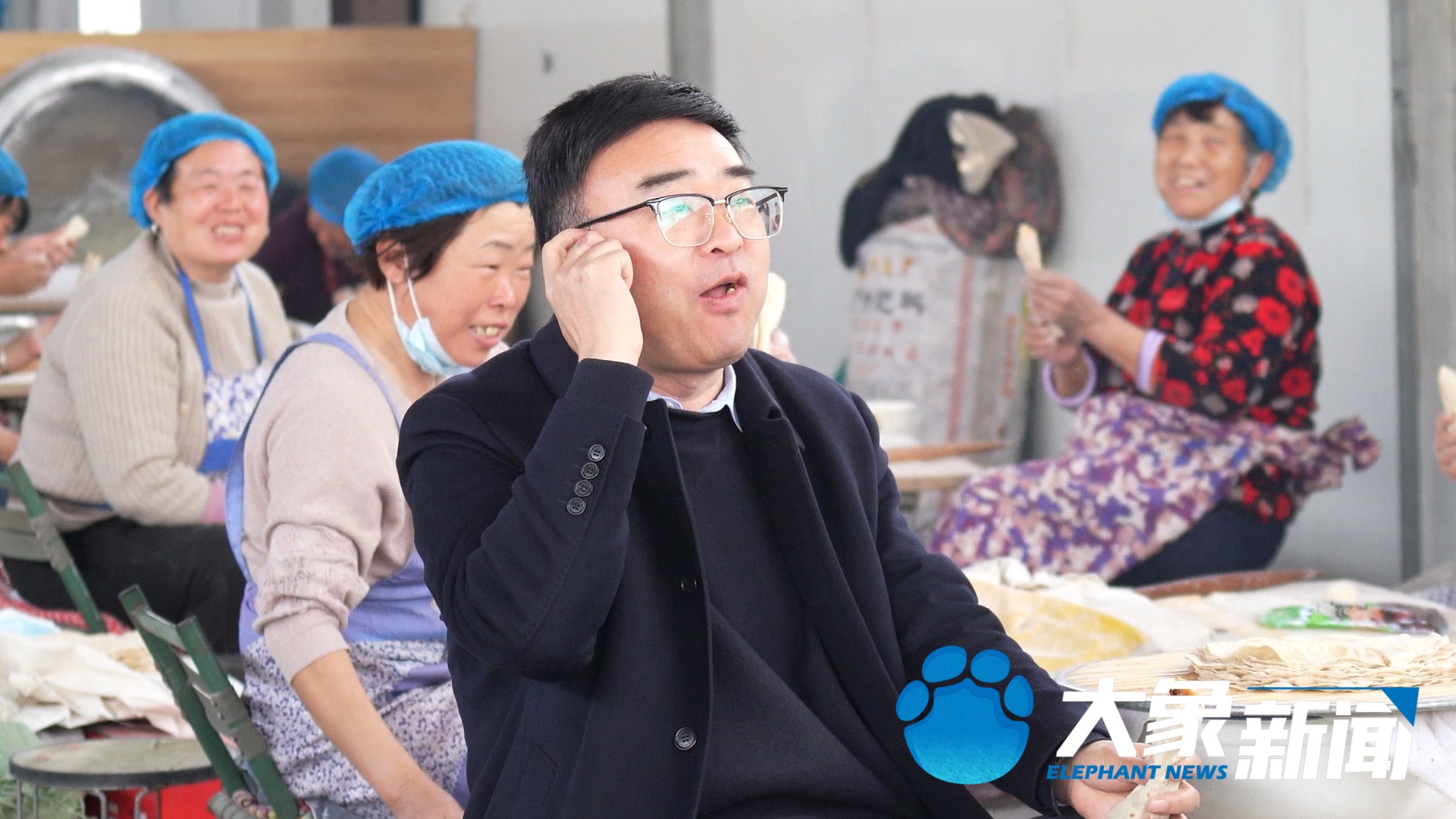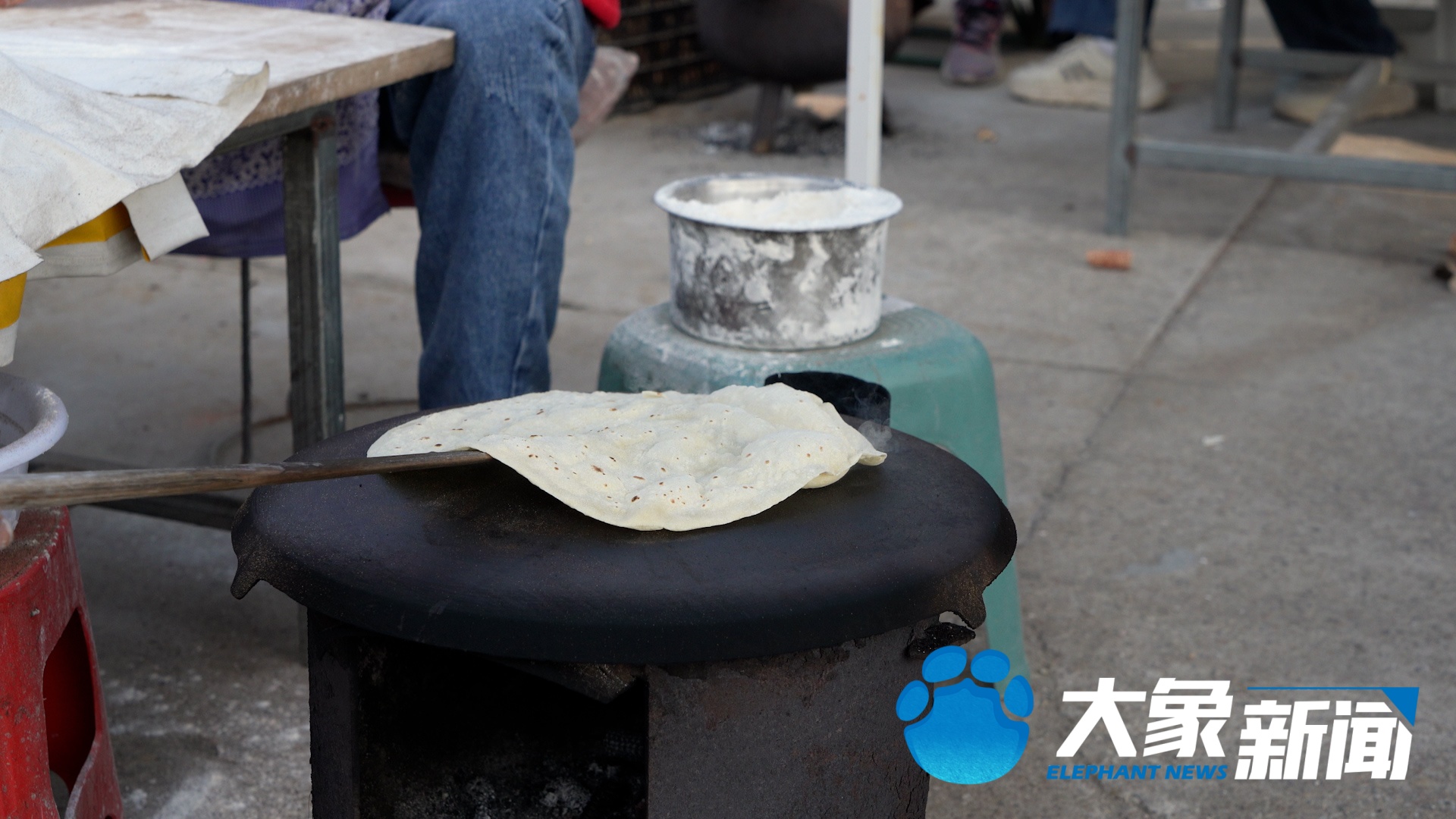 循着村民的指引,大象新闻《面孔》栏目记者在村西头的一顶蓝色大伞下,找到了名声在外的“烙馍驿站”。数十位老人两两一组,揉面、擀饼、翻烙,动作娴熟默契。伴随着鏊子下的柴火“噼啪”作响,一张张筋道的手工烙馍在案板上叠成厚厚一摞。