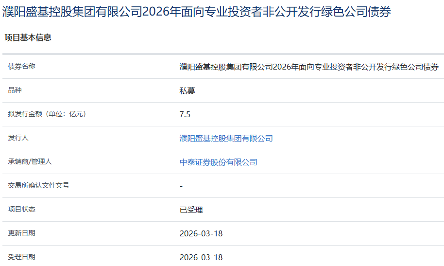 【大河财立方消息】3月18日,濮阳盛基控股集团有限公司2026年面向专业投资者非公开发行绿色公司债券项目获上交所受理。