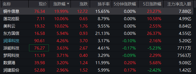 算力板块继续爆发,铜牛信息19.99%涨停,莲花控股、美利云10%涨停,润泽科技、东方国信、优刻得等涨幅居前。