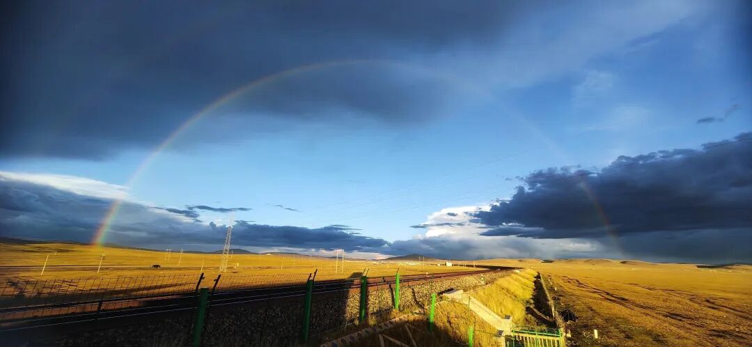 在青藏铁路沿线,我们刚刚完成设备检修,卸下一身疲惫,便看见风雨后的双虹凌空,横跨草原与钢轨。