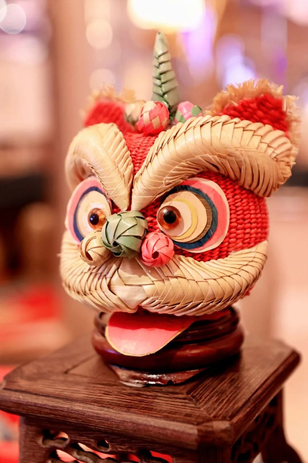 罗志勇棕编作品《醒狮》:选用优质棕榈嫩叶经过采叶、划叶、熏叶、泡叶、露叶、晒叶、高温染色、编制等精心制作而成,作品色彩鲜艳,活灵活现。