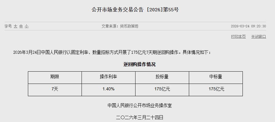 【大河财立方消息】3月24日,中国人民银行发布公告称,2026年3月24日中国人民银行以固定利率、数量招标方式开展了175亿元7天期逆回购操作。