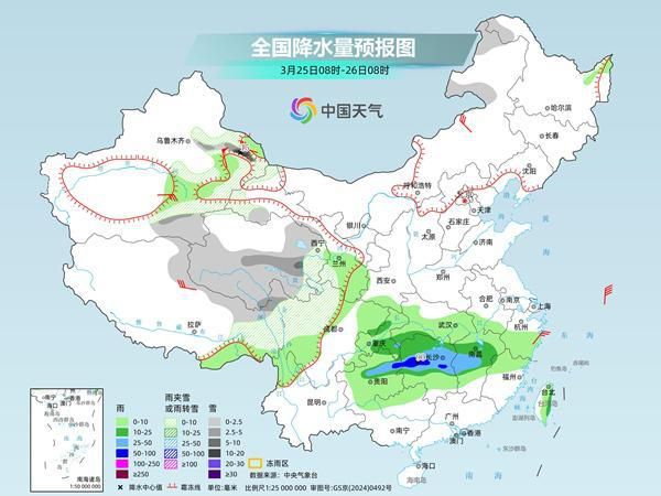明天,新疆东部、西藏东部、青海中南部和东部、川西高原等地部分地区有小雪或雨夹雪,其中,新疆东部、西藏东北部、青海东部等地部分地区有中到大雪,新疆东部等地局地暴雪。湖南中北部、江西中北部、重庆东南部、贵州东北部等地部分地区有中到大雨,其中,湖南中西部、贵州东北部等地部分地区有暴雨。