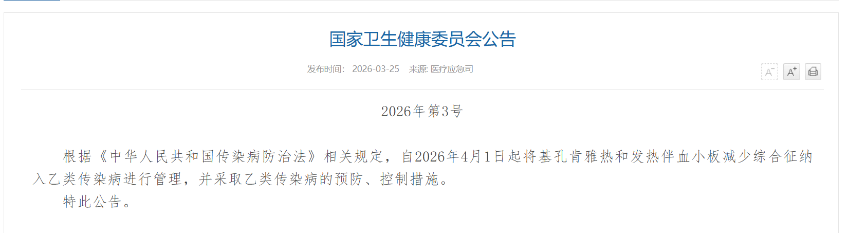 为进一步科学规范开展疫情防控工作,切实保障人民群众生命安全和身体健康,国家卫生健康委决定,自2026年4月1日起将基孔肯雅热、发热伴血小板减少综合征纳入《中华人民共和国传染病防治法》规定的乙类传染病进行管理,并采取乙类传染病的预防、控制措施。