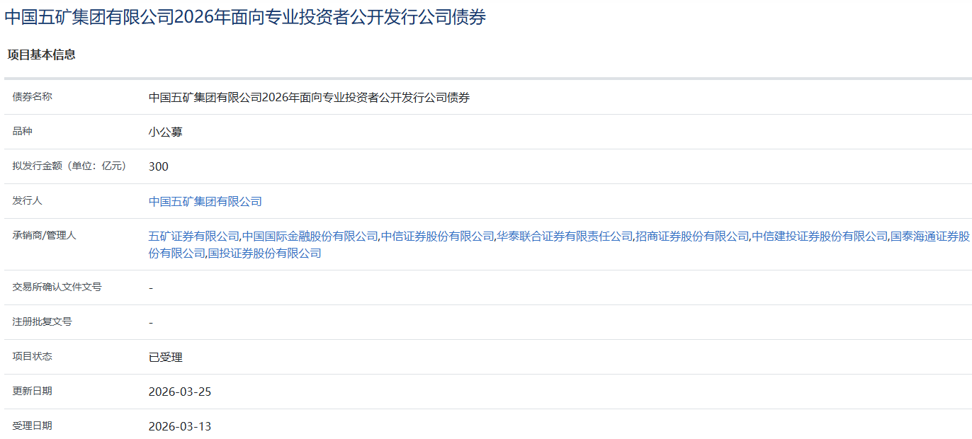 【大河财立方消息】3月26日,中国五矿集团有限公司2026年面向专业投资者公开发行公司债券项目获上交所受理。