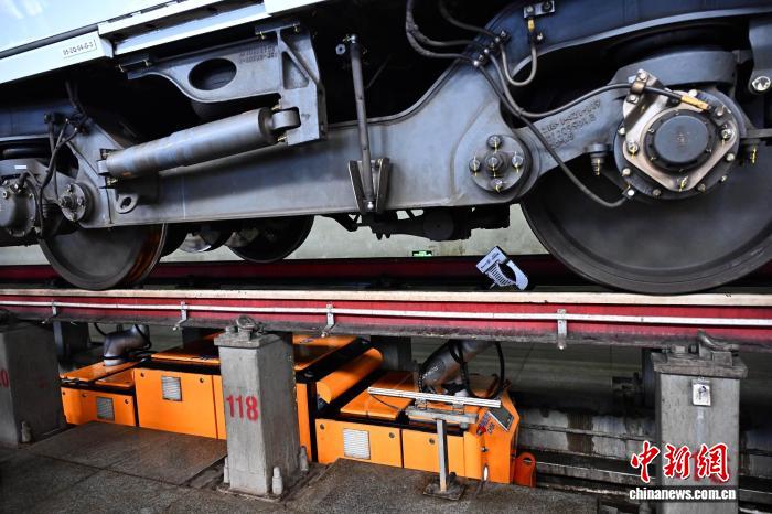 3月25日,位于福建省福州市的福州南动车所内,智能检测机器人正对动车组底部零部件进行全方位扫描。智能检测机器人34分钟即可完成一列动车组车底扫描,整体作业效率提升40%。中新社记者 张斌 摄