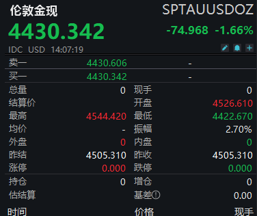 【大河财立方消息】3月26日午后,现货黄金、现货白银价格双双跳水。截至发稿,现货黄金报4430.34美元/盎司,下跌1.66%,现货白银报69.53美元/盎司,跌2.31%。