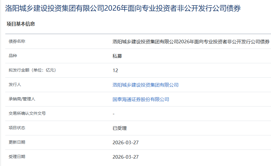 【大河财立方消息】3月27日,洛阳城乡建设投资集团有限公司2026年面向专业投资者非公开发行公司债券项目获上交所受理。