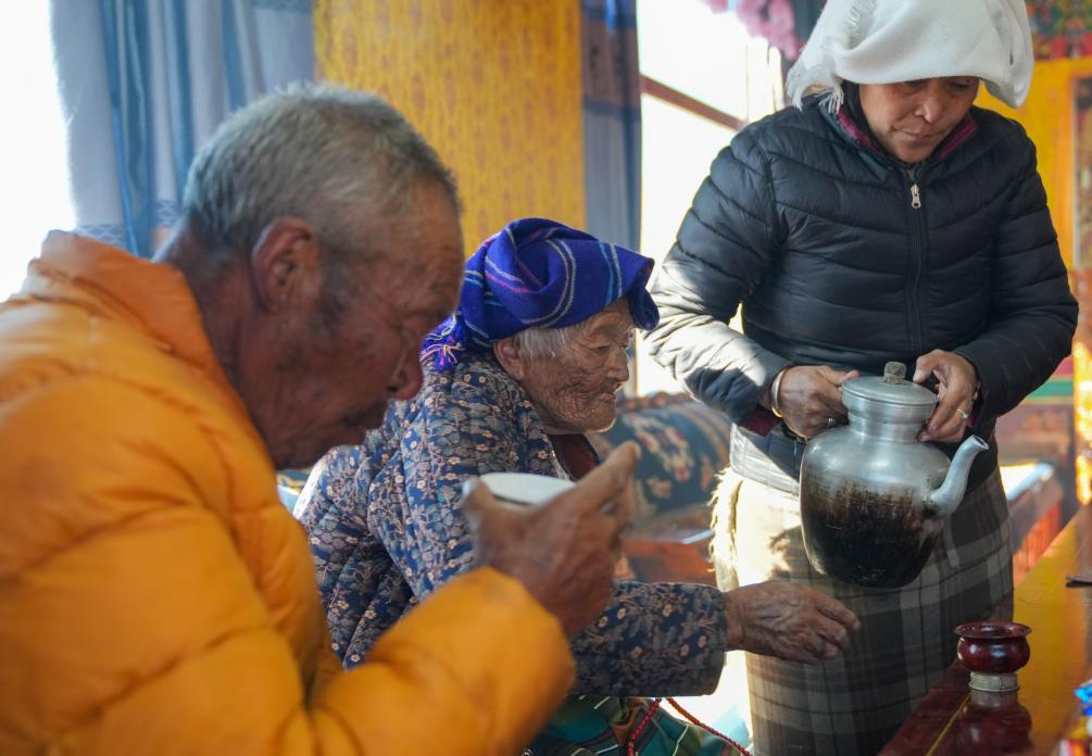贡觉曲珍(中)和家人在家中喝酥油茶(3月6日摄)。