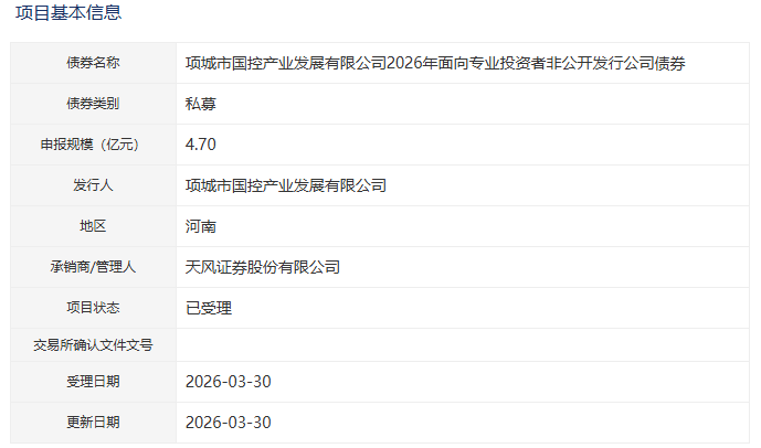 【大河财立方消息】3月31日消息,项城市国控产业发展有限公司2026年面向专业投资者非公开发行公司债券项目获深交所受理。本期债券拟发行金额4.7亿元,承销商/管理人为天风证券。