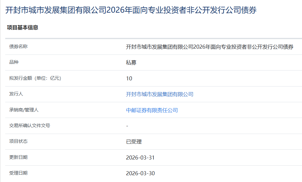【大河财立方消息】3月31日,开封市城市发展集团有限公司2026年面向专业投资者非公开发行公司债券项目,获上交所受理。