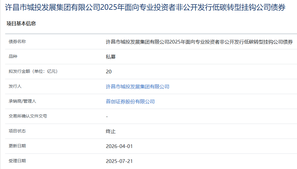 【大河财立方消息】4月1日,上交所债券项目信息平台显示,“许昌市城投发展集团有限公司2025年面向专业投资者非公开发行低碳转型挂钩公司债券”项目状态更新为终止。