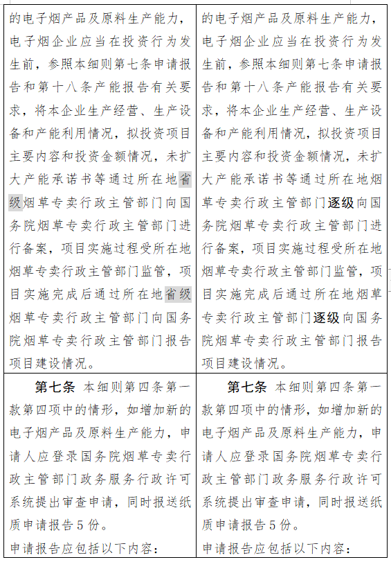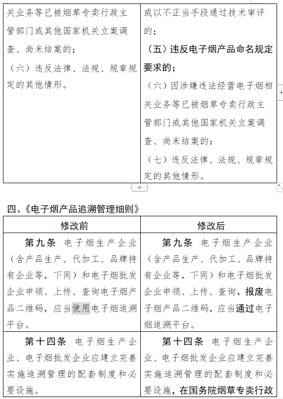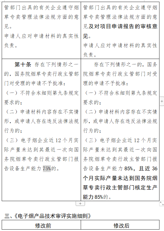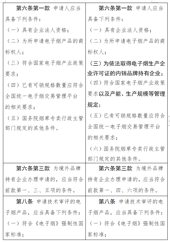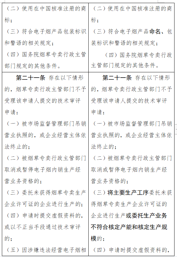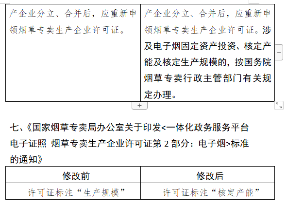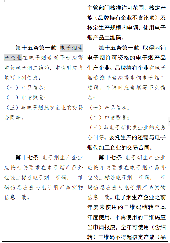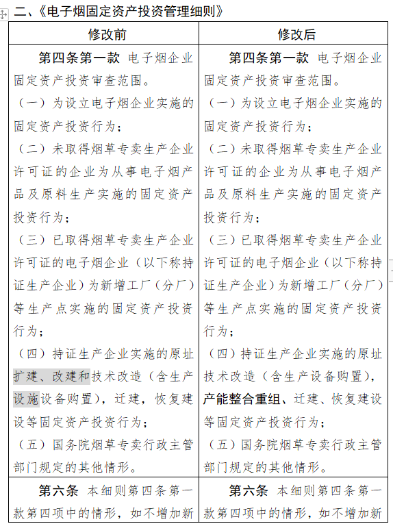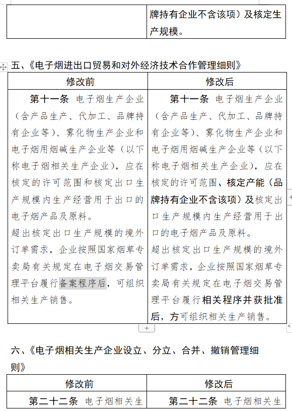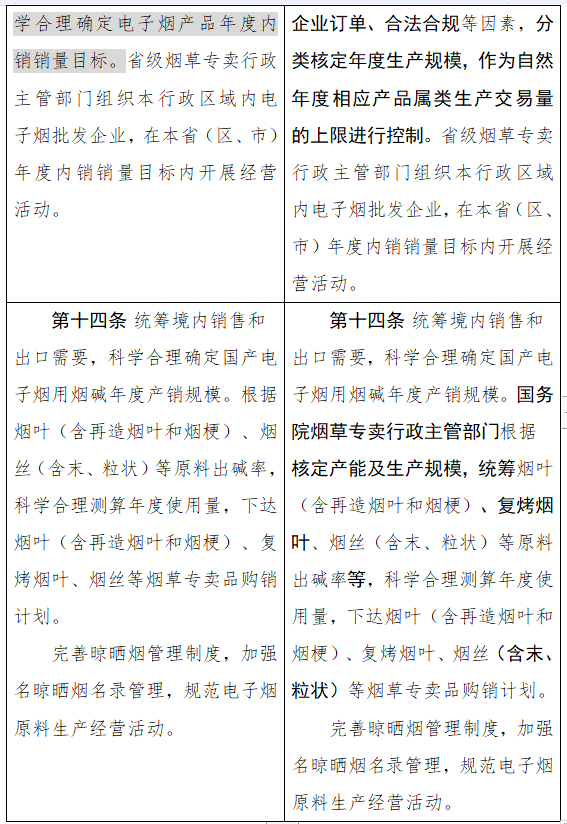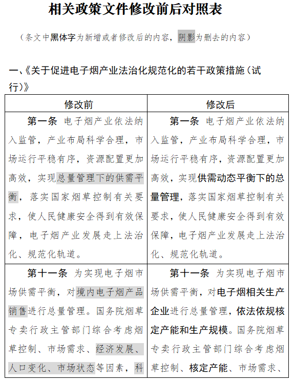 修改后的内容提到,为实现电子烟市场供需平衡,对电子烟相关生产企业进行总量管理,依法依规核定产能和生产规模。
