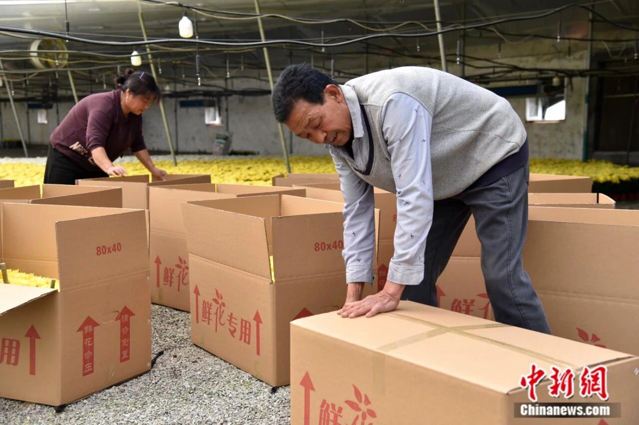 花农在大棚内将鲜菊打包、装箱。张敬伟 摄