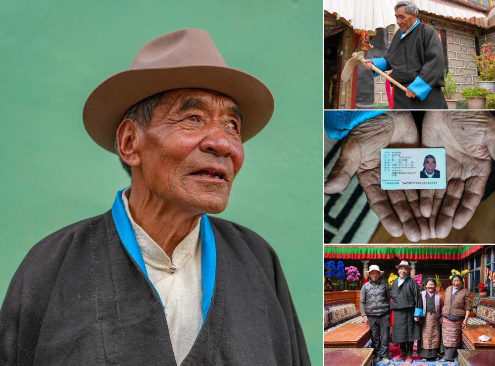 拼版照片:(左)白玛扎西的肖像(3月26日摄);(右上)白玛扎西(右)在家中喝酥油茶(3月26日摄);(右中)白玛扎西展示自己的身份证(3月26日摄);(右下)白玛扎西(中)和女儿、女婿在家中合影(3月26日摄)。